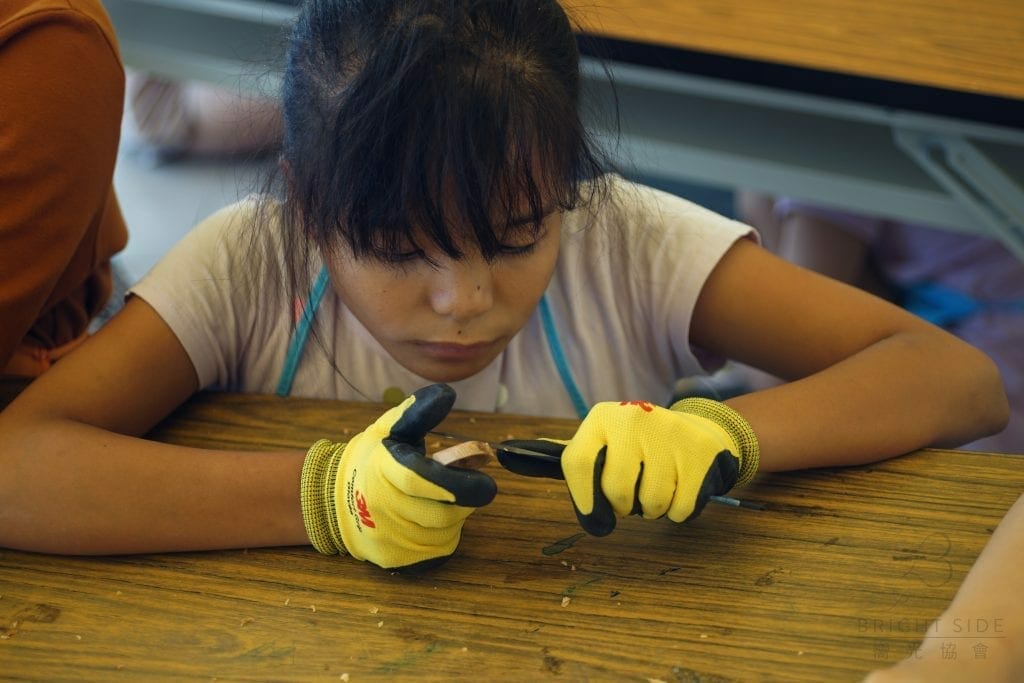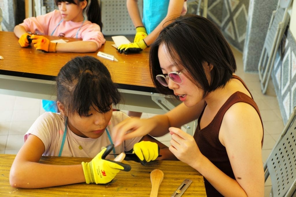 精雕慢琢的木工課程是第一次在台東舉辦。老師所使用的木頭材料皆為餘廢料,這次給孩子們使用的木頭是有著濃濃精油香的檜木,檜木因其柔軟的特性較適合拿來手作。經過老師細心講解步驟後,就是動手做時間!